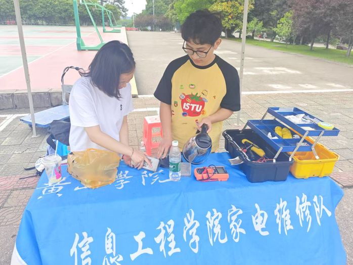 5月,太阳成集团tyc9728家电维修队在校内成功开展义务维修活动两次,面向师生提供小型家电免费维修服务。活动现场,队员们运用万用表、电烙铁等专业工具,对师生送来的故障电风扇、台灯、电热水壶等家电进行细致检测与维修。在排除故障的同时,队员们还向师生讲解家电使用保养知识,积极倡导绿色环保理念。