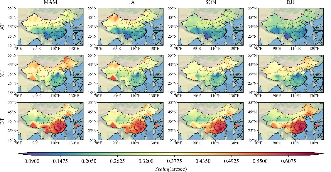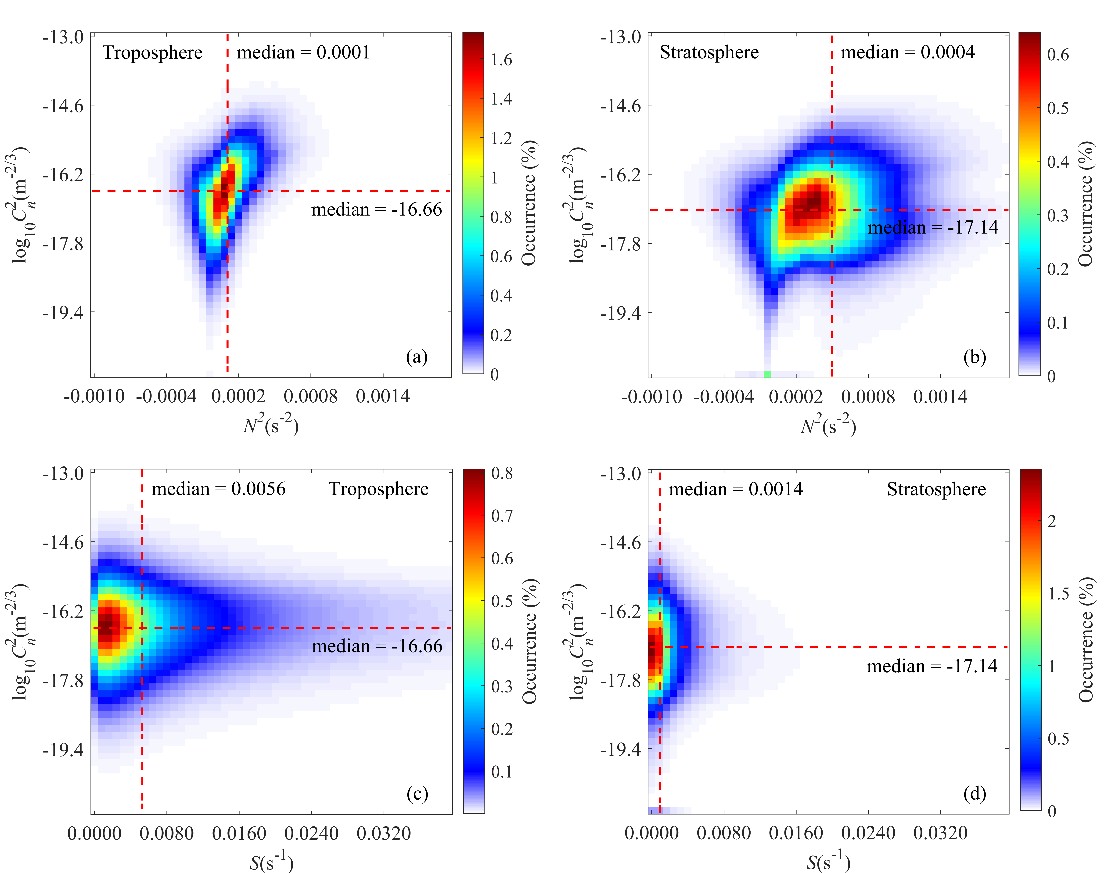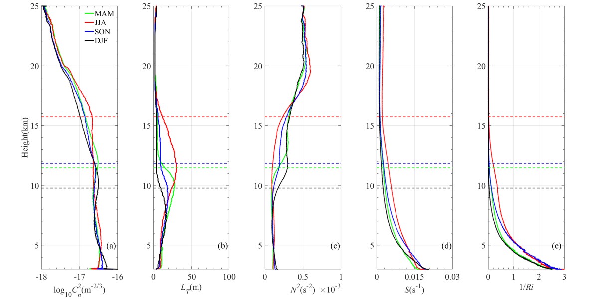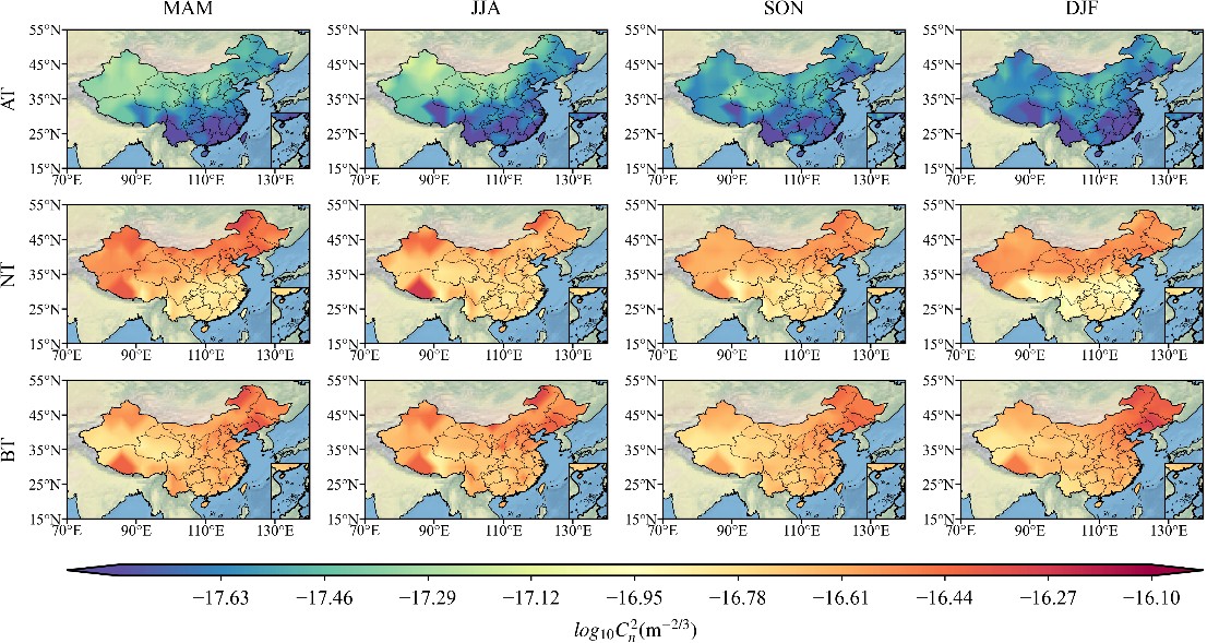 光束在大气中进行长距离传输时,易受光学湍流影响,导致光束漂移、闪烁及抖动等湍流效应,严重制约光电系统的性能表现。因此,光学湍流的分布特性是天文望远镜选点及自适应光学系统设计中必须考量的关键因素。本研究基于Thorpe方法量化分析了中国区域自由大气层的光学湍流特征。研究发现:垂直分布:对流层湍流强度显著强于平流层,且在对流层顶附近存在明显的湍流峰值。水平分布与季节变化:视宁度指标呈现“春夏高、秋冬低”的季节性规律。在对流层顶以下区域,湍流强度表现出鲜明的“南强北弱”地理分布特征。成因分析:对流层内较弱的大气稳定性和较强的风切变是导致湍流活动剧烈的主要原因,当浮力频率趋近于零时,静态不稳定性的增加显著加剧了光学湍流强度;而平流层则因其较高的静态稳定性,维持着相对较弱且分布均匀的光学湍流。