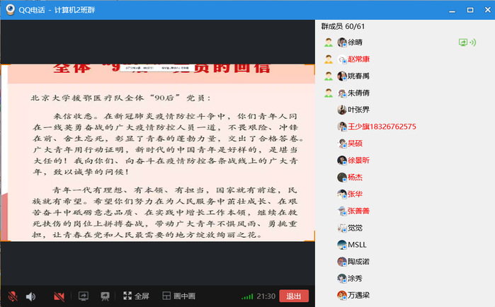 2020年5月4日,19计算机二班组织同学们线上集合观看电影《建党伟业》,由组织委员为同学们讲解电影背景,阐述五四精神,表达此次观影的目的和意义。观影过程中,同学们积极将深刻的片段截屏发送到班群之中与大家分享,观影结束,同学们在组织委员的带领下阐述自己对五四精神的理解。最后文艺委员组织大家共同唱响《光荣啊,中国共青团》,结束本次观影活动。