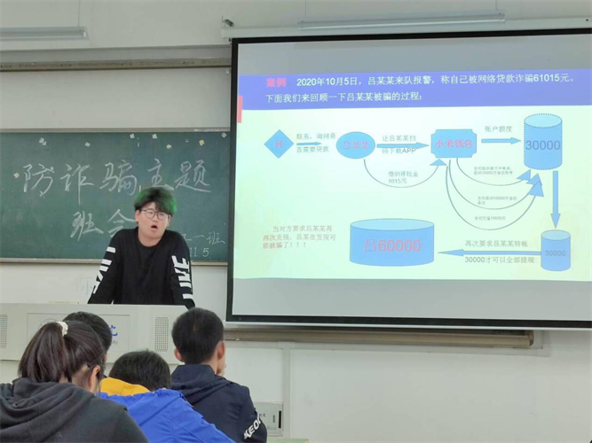 金秋时节,莘莘学子在享受大学生活的同时,财产安全问题也愈发不容忽视。2020年11月5日,为防患于未然,我班响应公安部门的号召,由安全委员汪涵同学为主讲,在文端楼2409教室以主题班会的形式对软件工程一班的同学进行了防诈骗知识普及。