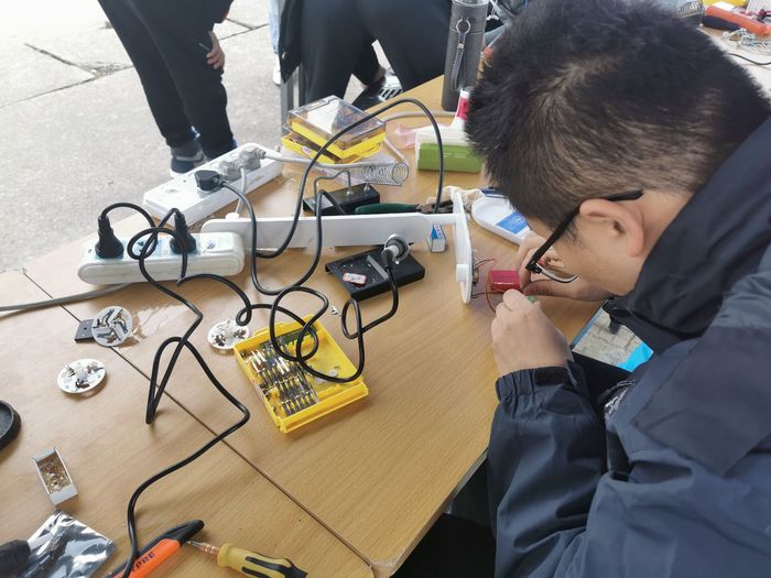 此次活动的主力是大一的新生队员,目的就是为了帮助同学和老师们维修一些器件,比如:耳机、充电宝、电水壶、电脑、刮胡刀、洗脚盆、电风扇、电吹风、扫地机器人等等。早晨九点,维修队员就已到达维修地点,随后将工具摆放整齐并通上了电。维修队员们认真对待送修人员,将收到的电器一一登记,认真检查故障,确认修理好后,及时联系对方取回。最终,成功修理好20多件家电。