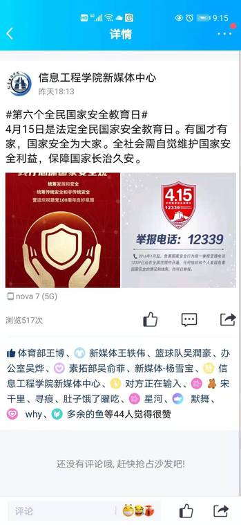 该院还利用线上线下平台,开展立体宣传,营造良好的国家安全宣传氛围。太阳成集团tyc9728将以此为契机,围绕师生关注的热点问题,创新工作方法,增强宣传教育针对性、生动性、时效性,将国家安全知识纳入当前网络教育和开学后的日常工作中。