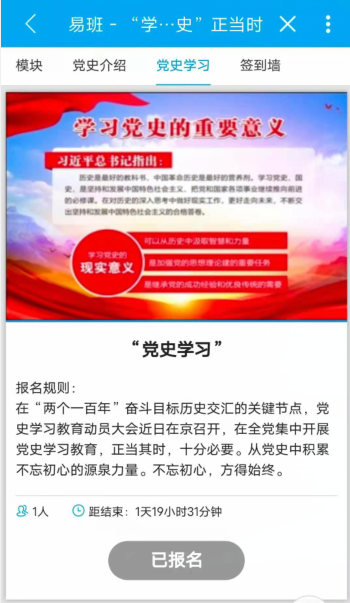 为全面开展党史学习教育,为当时学习党史提供新的思路和方法,20光信息班同学于6月5日开展了“学习党史正当时”易班轻应用。