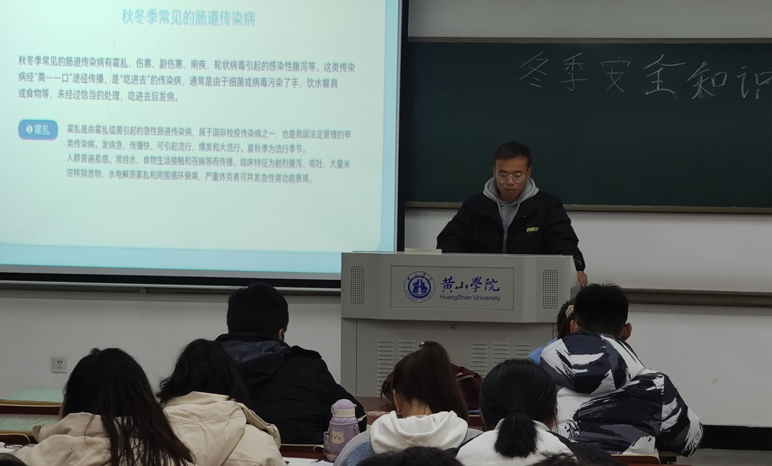 首先,从冬季气候变化、昼夜温差等因素导致呼吸道传染病高发的原因讲起,以新冠肺炎、肺结核、流行性感冒、水痘、流行性腮腺炎等冬季高发传染病为例,从传播途径、主要症状、易感人群、预防措施等方面向同学们做了详细介绍。接着,通过放映PPT的形式,同同学们进行了互动交流。宣讲的同学向大家系统而又生动地讲解了一些常见传染病,并通过典型病例和数据分析,提醒同学们一定要注意个人卫生,养成良好的卫生习惯,勤洗手、常开窗、多喝水,加强体育锻炼,增强个人体质,才能远离疾病。