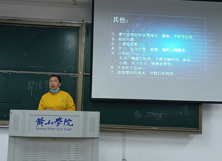 老师首先介绍了有关心理健康的知识,分别从三个方面对同学们进行了心理健康教育,一,面对学业压力,希望同学们能够适当分解合理规划,对在修课程、补修课程分阶段的一项项学、一门门过,摒除“一口吃个胖子”的想法,同时借助网络资源进行辅助学习,增长必要的知识和技能,有兴趣有能力的同学还可以拓展学习,学习比较吃力的同学做好当下就好,也是一种成功与取得,一定根据自己能力进行规划。二,针对目前疫情期间出现的情感方面的教育,老师向同学重点针对近期出现的异地恋、发展取向不同导致的情感问题给与了一些建议的处理方式。三,针对当下疫情封校,给同学们提出来一些打发课余时间和周末空闲时间的小建议,期望同学们能够走出宿舍,开展一些小活动,即使封校也要把大学生活过的多姿多彩。