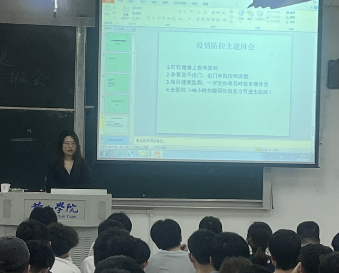 4月26日,为进一步推进疫情防控方面的工作,开展了有关疫情防控的班会。本次班会由辅导员主持,全体同学按时到场。