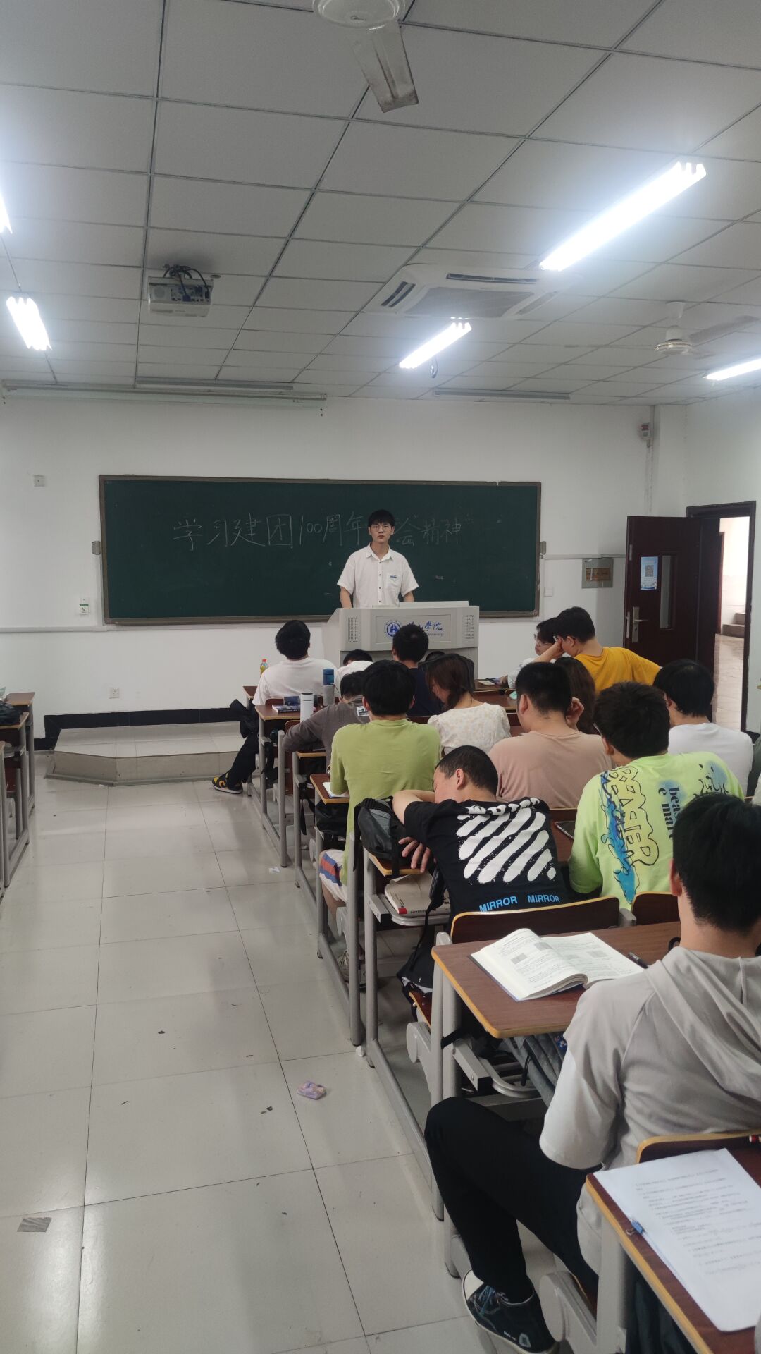 为深入学习贯彻习近平总书记提出的“青年一代有理想、有本领、有担当,国家就有前途,民族就有希望”,促进团员青年养成“勤学、修德、明辨、笃实”、“爱国、励志、求真、力行”的良好品质,同时庆祝中国共产主义青年团成立一百周年,20光信息于5月30日上午10时许在文端2503教室开展了“学习建团100周年大会精神”教育全班同学共五十余人参加了此次班会。