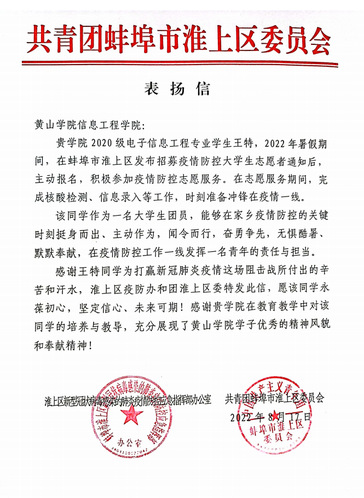 近日,我院收到淮上区新型冠状病毒感染的肺炎疫情防控应急指挥部办公室、共青团蚌埠市淮上区委员会发来的感谢信,信中对我院20电子信息工程专业的王特同学予以表扬,并对我院培养出有家国情怀的优秀学子表示感谢。