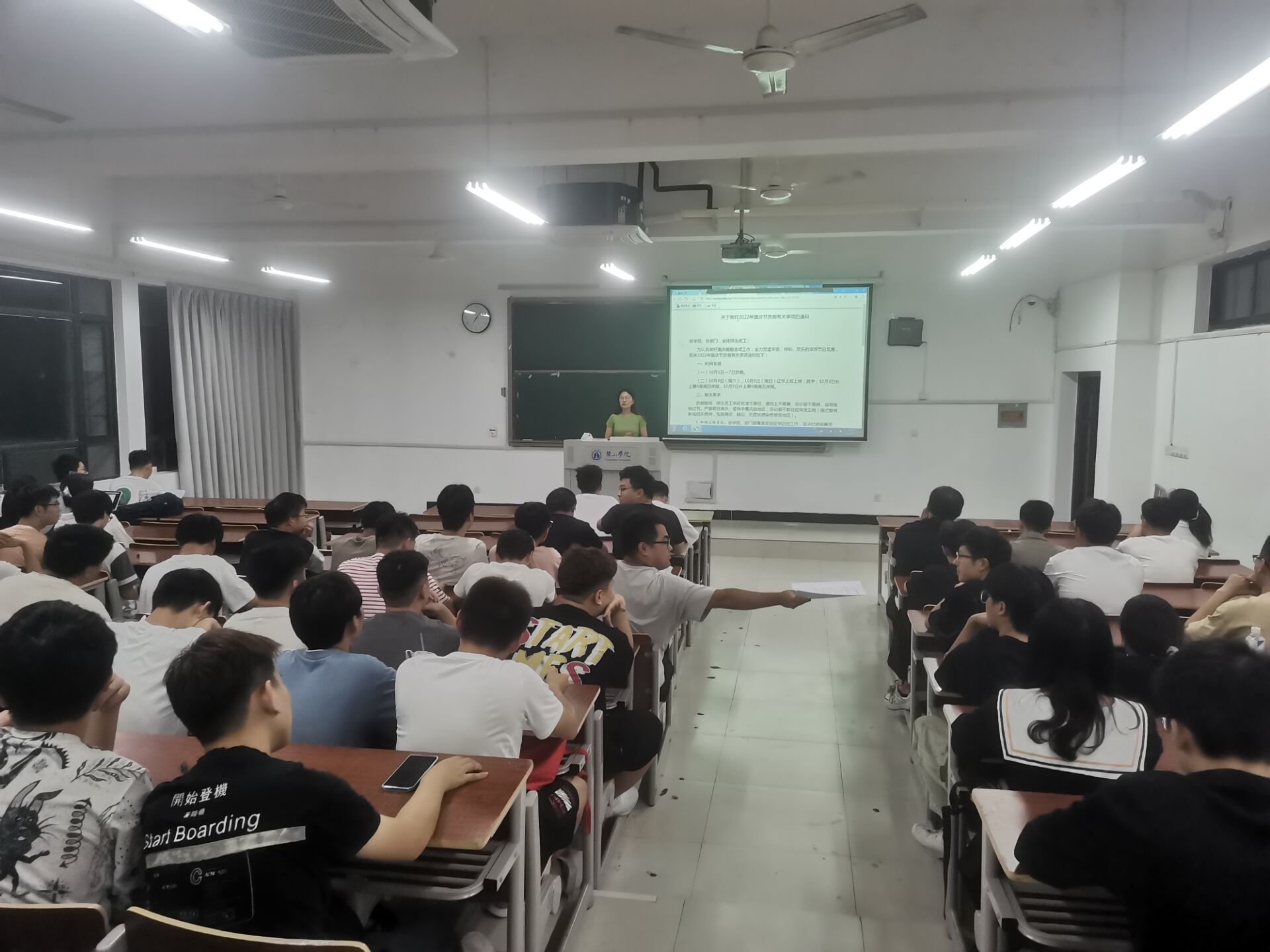 首先辅导员胡老师上台为我们讲述了国庆期间,我们要注意好个人防控,留校的同学们避免去人多的地方,离校的同学们要注意疫情防控,遵守防疫政策;出省的同学们要时刻警惕。出校的同学要每天钉钉打卡和健康上报。学生返校要遵守学校的防疫政策:不能私自返校;省外的同学要提前报备,实行“三天两检”,持有二十四小时内的核酸证明。其次国庆在外要注意交通安全,遵守交通规则,保障个人的生命和财产安全。饮食方面注意要饭前饭后洗手,不要暴饮暴食,保障自身的身体健康。最后,不论在校还是返校的同学都要注意用火用电安全,钉钉打卡和健康上报要及时完成。同时,针对假期饮食健康安全、财产安全、人身安全等内容进行了强调。