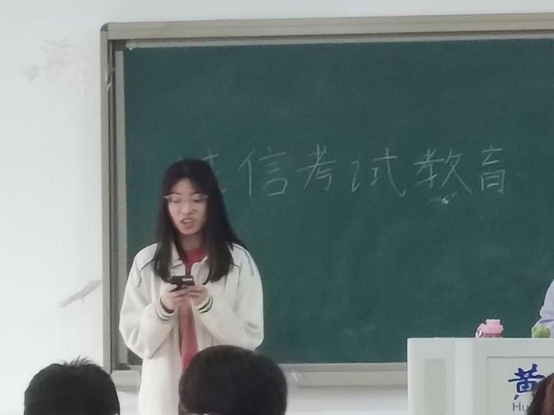 学习委员在会上讲解了关于作弊的危害。对于当代大学生来讲,明礼诚信是立身处世之本,是走向社会的“通行证”。诚信自古有之。我们都拥有勤劳的双手和聪慧的大脑,我们要充分把握复习时间,勤奋求知,夯实基础,认真准备好每一门功课,以诚信的态度对待每一场考试;在考场上,我们要摩拳擦掌,施展自己的真才实学,以争取优异成绩,以诚信展现良好学风。