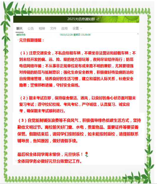 鉴于21光信息本周正在进行金工实训,学习时间比较紧凑,元旦假期安全提醒以通知群的方式向同学们发布,同时也提醒家长予以关注。