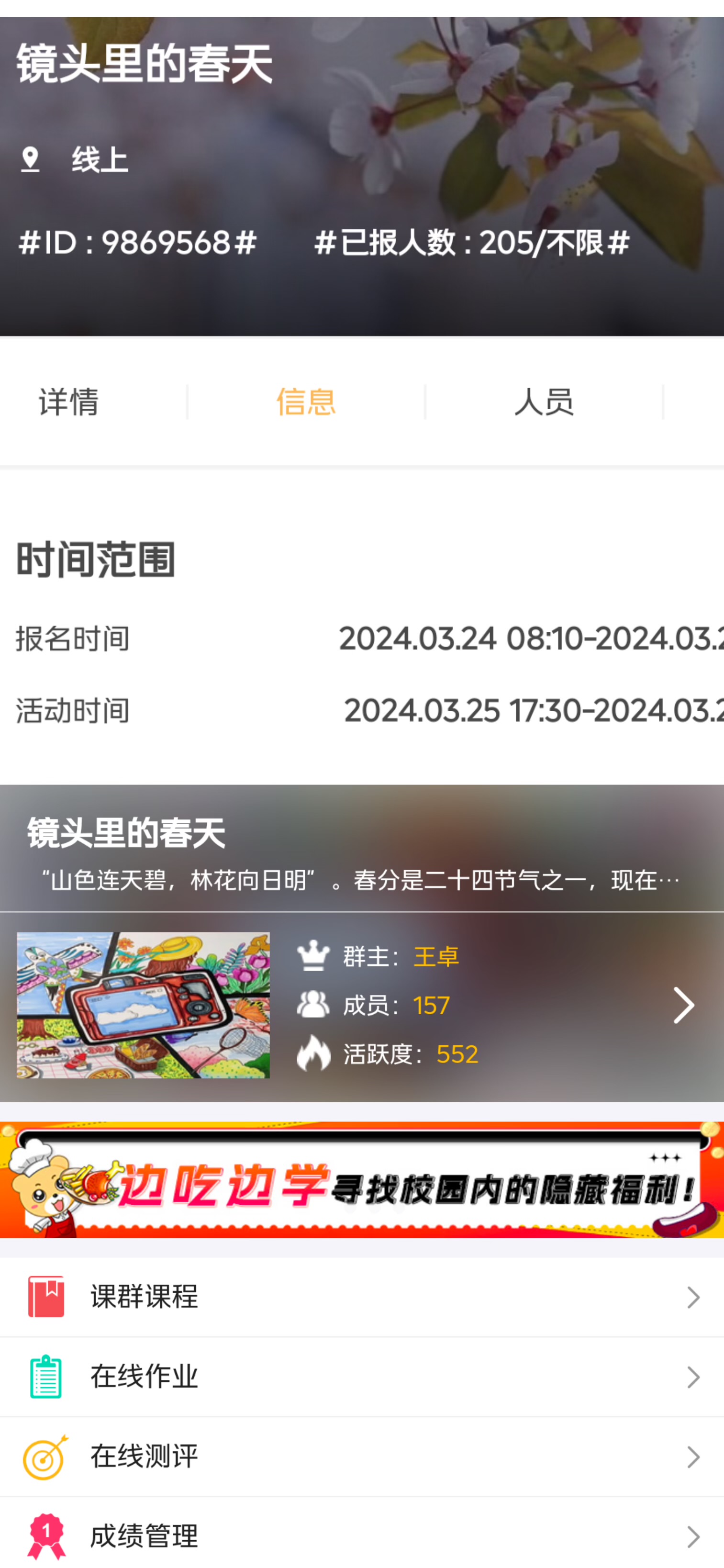 该活动主要是线下线上结合,通过易班优课平台进行。在易班优课中观看学习有关春分节气知识的视频,并在易班优课提交有关春天景色的作品等,同学们通过图片展示了四季的变化和节气的更替,并通过易班优课在线作业形式来获取作品。
