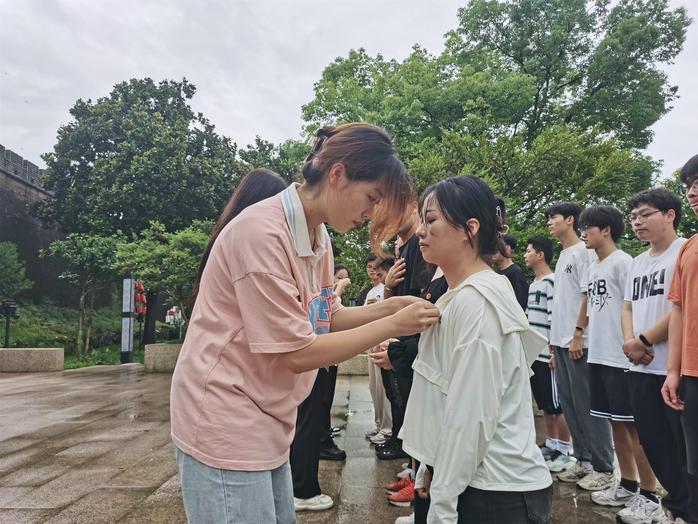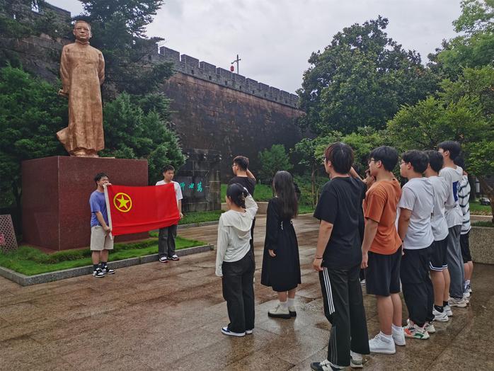 参观结束后,大家来到行知公园陶行知先生雕塑前,随着《义勇军进行曲》响起,全体人员肃立共唱国歌,方淼晖宣读入团名单并向新团员表示祝贺,接着由老团员代表为新团员戴上象征成长和责任的团徽,随后新团员们面向团旗右手握拳举过肩庄严宣誓,铿锵有力地说出自己成为新团员的心声,立志做一名优秀的共青团员。老团员代表宣读团章中团员义务和权利的条款。仪式在团歌《光荣啊,中国共青团》合唱中结束。
