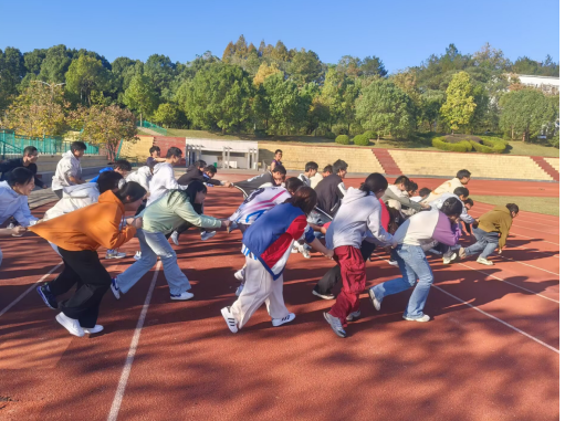 在“乌龟竞走”活动中,同学们自行组队,每10人一组,其规则为:每组在同一起跑点,学生需蹲着并拉着前一个人的衣服,听组织者的指令开始进行比赛,第一个冲过终点的小组就可以获得最后的胜利。在这个游戏中,同学们尝试着与队友配合,增强了队伍的协调能力,清除了同学们之间的隔阂,增强了合作意识。