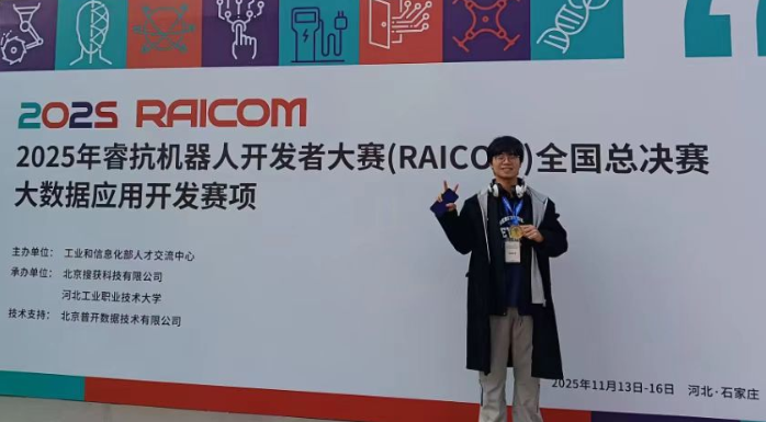 11月13日至16日,2025年睿抗机器人开发者大赛(RAICOM)全国总决赛大数据应用开发赛项在河北工业职业技术大学举行。我校软件工程专业学生冯克锋凭借出色表现,荣获全国总决赛一等奖,指导教师沈来信获评“优秀指导教师”称号。