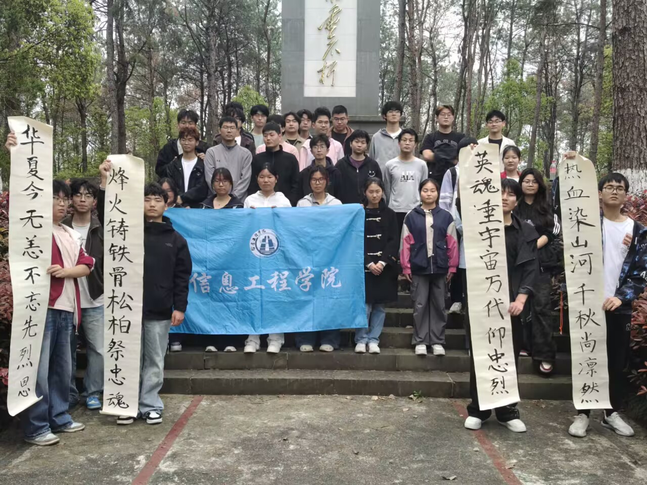 敬献鲜花环节后,同学们现场挥毫泼墨,以笔墨寄哀思、以书法传敬意,写下饱含深情的书法作品,用传统文化的方式缅怀革命先辈,传承红色精神。活动尾声,全体同学在烈士纪念碑前合影留念,将对先烈的缅怀与敬意定格于画面之中。
