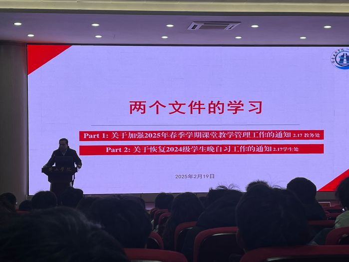 随后,马堃教授详细解读学校《关于加强2025年春季学期课堂教学管理工作的通知》和《关于恢复2024级学生晚自习工作的通知》两个通知精神,对接下来大家的学习纪律提出明确要求。