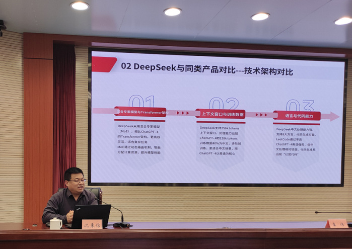 3月3日下午,黄山市政府办公室举办DeepSeek应用专题讲座,市政府系统办公室120余名干部职工参加。市政府秘书长李炜主持。此次讲座邀请我院人工智能教研室沈来信教授,以《DeepSeek简介及在政务中的应用》为主题,从DeepSeek技术概述、政府场景应用、操作技能演示、知识库构建与模型微调等10个方面,深入浅出地讲解了DeepSeek的核心功能、操作流程及应用场景。